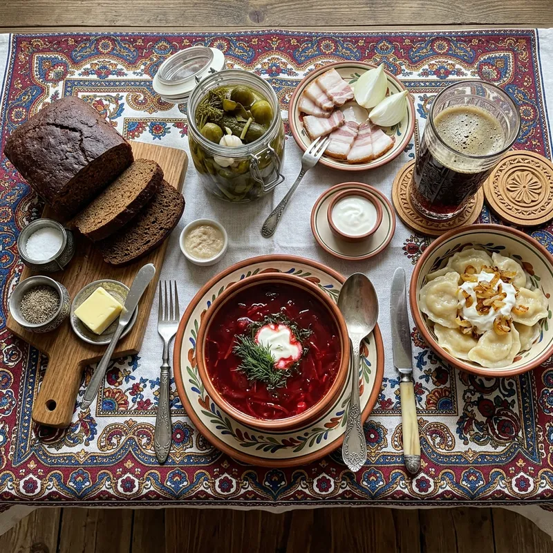 A traditional Russian meal viewed from above. The image should highlight the composition of the meal with various classic Russian dishes such as borscht, black bread, pickles, and perhaps a glass of Kvass. The tablecloth should be ornately patterned in a way that is typical of Russian design, with vibrant colors and intricate designs. The cutlery should be traditionally crafted, reflecting its cultural significance. The arrangement of dishes should be neat and coherent, indicating the order in which they are typically consumed.