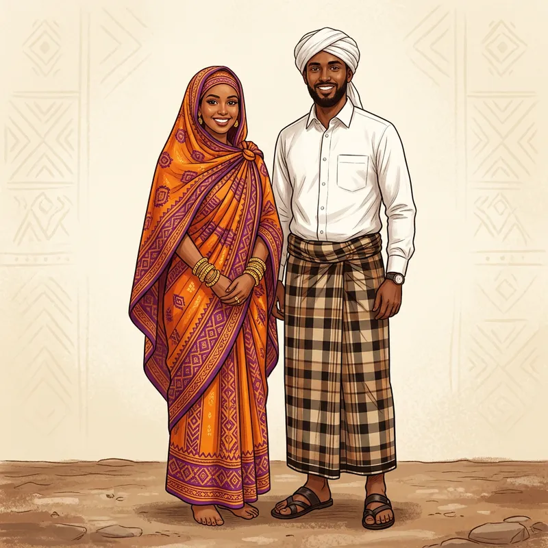 An illustration of traditional Somali clothing. Two figures, one male and one female, are shown in full length. The male wears a macawis, a checkered sarong in shades of brown and black, with a crisp white shirt. He has a turban around his head. The female wears a guntiino, a vibrant orange and purple drape-like dress with intricate patterns, with gold bracelets adorning her wrists. She also wears a shash, a large matching cloth draped over the head that flows down to the back. The backdrop is a simple, subtly patterned cream color, allowing the subjects to take center stage.
