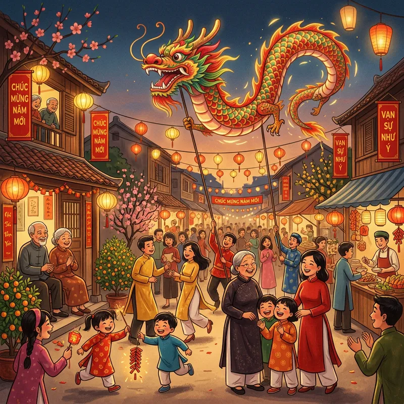 An illustrative representation of a traditional Vietnamese Tet festival. Various people of different genders and ages, representative of the cultural diversity, are engaging in festive activities under soft and warm lighting, akin to a vintage film capture. The spirit of the celebration is palpified by their joyous expressions and cheerful demeanors. Dominating the sky above is a vibrant, beautifully detailed dragon, gracefully soaring, heightening the festive atmosphere. The overall scene highlights an overarching theme of cultural heritage and communal joy.