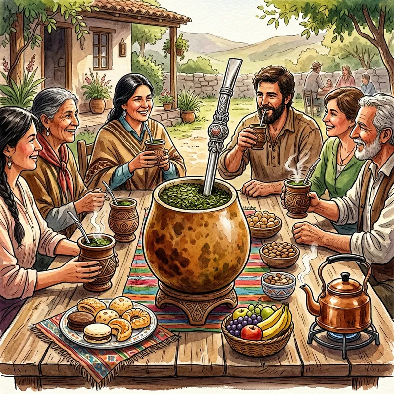 An illustration of a traditional yerba mate drinking setting. In the middle, a gourd with rich, dark green yerba mate leaves is filled to the brim. A silver bombilla, with intricate engravings, is used for sipping the mate. This is traditionally a communal experience, so surrounding the gourd are a group of exquisitely crafted wooden mate cups, each filled with steaming yerba mate. An assortment of snacks is also laid out, including pastries, fruits, and nuts.