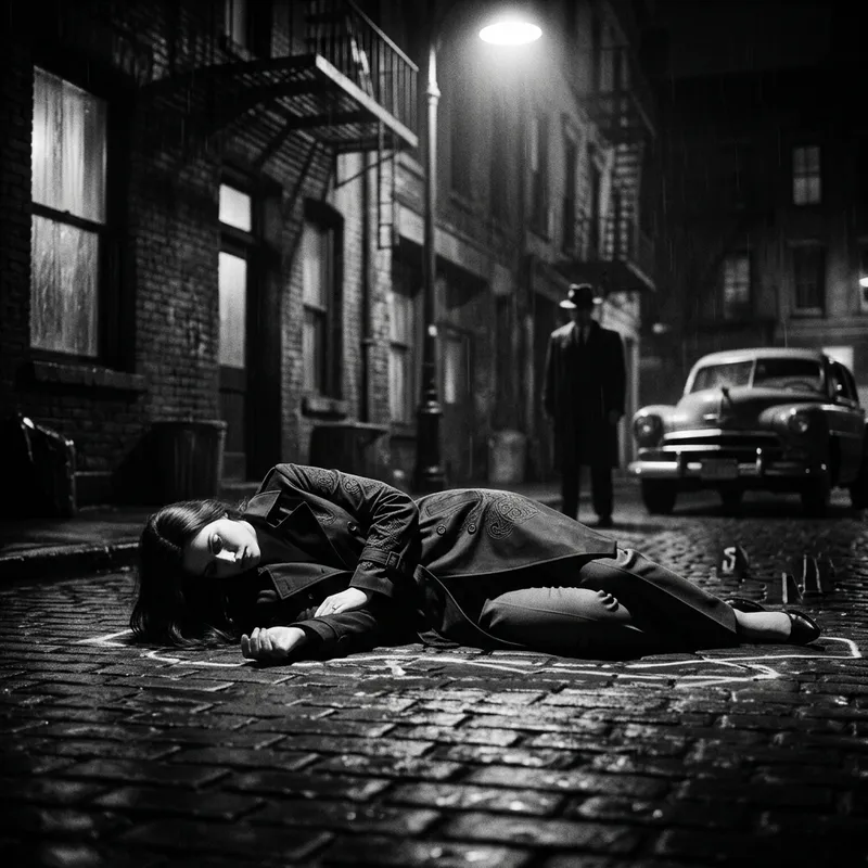 A prolonged depiction in the style of a black and white photograph capturing a woman with long black hair, who's lying motionlessly on the ground. The scene is saturated with an atmosphere of tragedy, akin to the cinematic frames in film noir. Rendered in dramatic lighting featuring robust shadows, the scene also highlights the complex carvings on her figure, possibly suggesting a crime scene. This composition is flawlessly intricate, a testament to the calibre of a Leica M Monochrom, f/2.8, 50mm lens, the resulting haunting and masterfully composed image reminiscing the aesthetics of a noir crime photography.