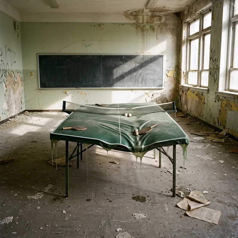 Tragic Ping Pong Table Melting Alone in Deteriorated Classroom