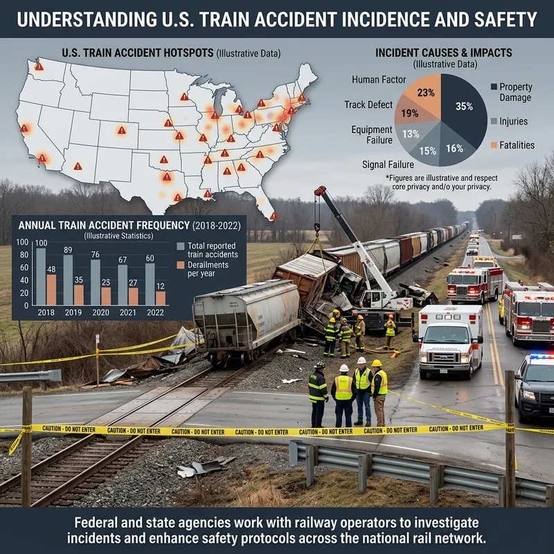 A realistic visualization of train accidents in the United States. This graphic could include images of damaged trains, incident sites bracketed with caution tape, and emergency crews at work. Statistics regarding frequency and impacts of such accidents should be integrated into the scene as informative graphics, such as bar graphs or pie charts. Also incorporate a map of the United States, marking locations where the most frequent or severe accidents have occurred. The overall aesthetic should be sobering, underscoring the seriousness of the stats and incidents depicted. Please ensure the representation is respectful.