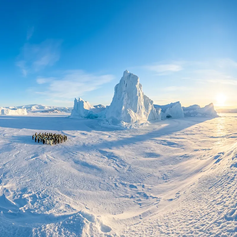 Create a serene picture of Antarctica. The landscape is filled with vast, snow-covered plains stretching on till the horizon. Jagged, frosty icebergs rise dramatically from these glistening plains under the clear, vibrant blue sky. The sun hangs low in the sky, casting long, ethereal shadows across the terrain. Far in the distance, a group of emperor penguins huddle together for warmth, their black and white forms popping against the all-encompassing white. The scene is of tranquil beauty and quiet solitude, painting a picture of the frozen, untouched wilderness of the Antarctic.
