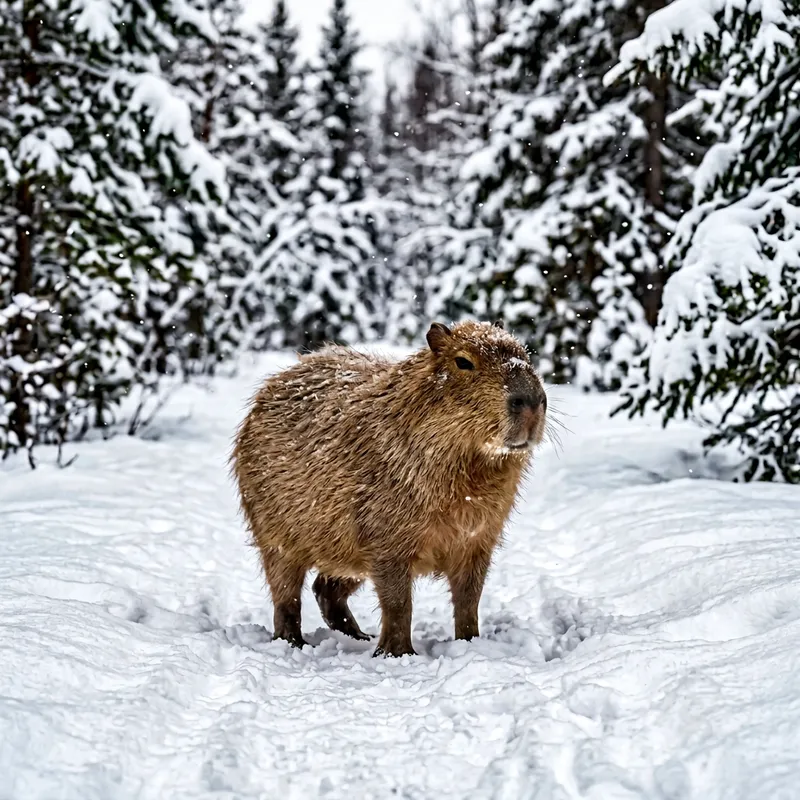 A capybara in a snowy landscape. The capybara, the largest rodent in the world, stands on the pearl-white snow with a few flakes gently falling around it. It has a bulky stature, with coarse, slick fur and a face full of serene contentment. The snow around it is undisturbed, pristine, and sparkles under the soft glow of the winter sun. The atmosphere is tranquil, tempting one to immerse into this peaceful winter wonderland with the capybara.