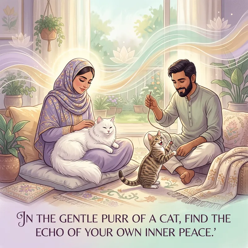Create an enlightening and soothing poster, presenting a blissful imagery of tranquility that originates from interactions with cats. Illustrate a serene environment where a Middle-Eastern woman and a South Asian man are bonding with their feline companions. Both are unique in their ways, with the woman affectionately stroking a fluffy white cat and the man playing with a playful tabby. Ensure that the colours radiate calmness and harmony. Add an inspiring quote about inner peace and the joys of cats at the bottom in elegant typography. Include symbolisms of peace like waves of tranquility, lotus flower or soft glowing light.