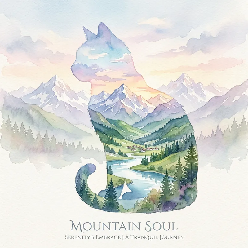 Imagine a double exposure image where a silhouette of a cat is seamlessly intertwined with a picturesque mountain scene. Think of a serene landscape, filled with majestic mountain peaks, lush greenery, and a pristine sky. The cat, outlined delicately, forms part of this natural panorama, adding a distinct touch to the scene. The entire composition should be done with a watercolor effect, giving it a sense of tranquility and subtlety. Furthermore, it has to represent a cinematic quality that brings the poster-like design into the frame. Generous use of pastel shades will augment the idyllic ambiance of the piece.