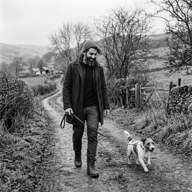 A picture of a 33-year-old Middle-Eastern man dressed in athletic attire, sporting a beard and a warm coat, leisurely strolling through the hushed tranquility of the countryside. Beside him scampers a playful brown and white Jack Russell Terrier, engaged in the simple joy of the moment. The scene is captured with the charm and exceptionality of a vintage film camera, exuding the distinct grainy effect of a black and white photograph that transports one to a gentler time and serene natural surroundings.