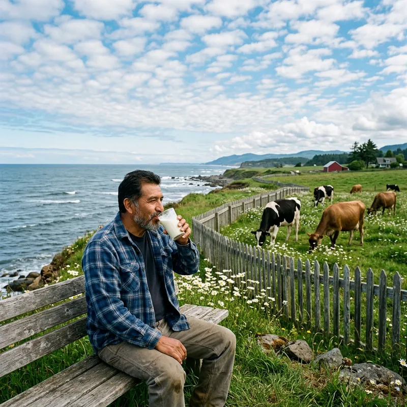 A tranquil farm with cows near the Pacific Ocean. Lining the water's edge, a Hispanic man is seated savoring a glass of kefir. The quite pastures are dotted with daisies and under the sky, which is teeming with fluffy white clouds, the wind gently sways the ripples on the ocean surface. Nearby, the cows graze lazily, their heads bent towards the luscious green grass. A wooden picket fence snakes its way around the grasslands, marking the boundary of the farm. The man is dressed in casual clothing, his face reflecting the peace and solitude of the scene.