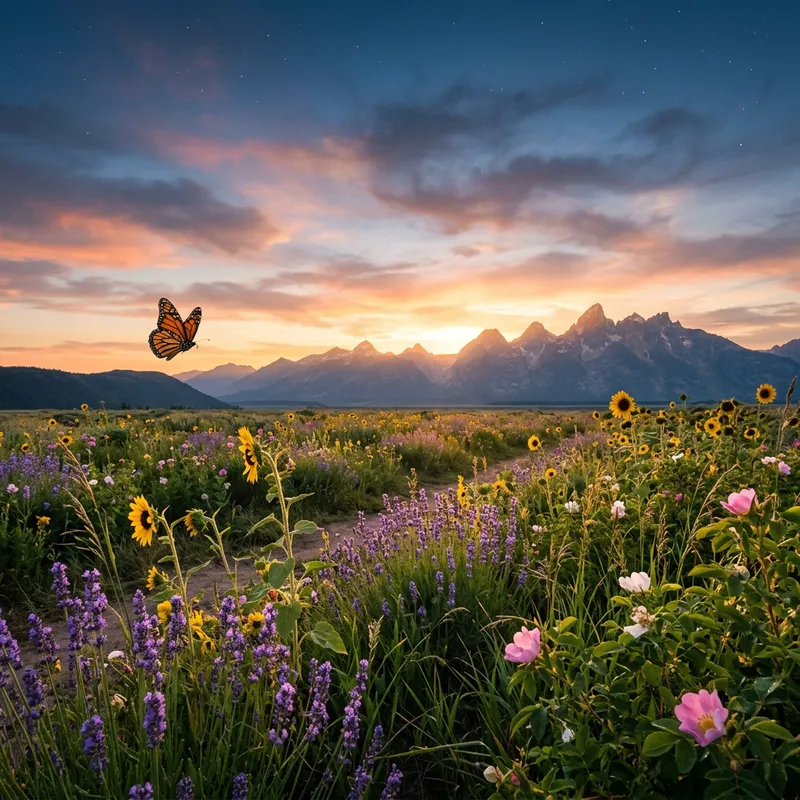 A peaceful meadow enveloped in the golden rays of the setting sun. This calm scene features diverse flora such as lavender flowers, tall sunflowers, and wild roses, swaying with the evening wind. A lone monarch butterfly flies across the field. In the distance, a mountain range stands against the horizon, highlighted by the last sun's rays. Above it, the sky turns into a canvas of colors; hints of fading sunlight intertwine with the cool hues of twilight. Specks of the first evening stars appear, adding an element of mystique to this serene countryside landscape.