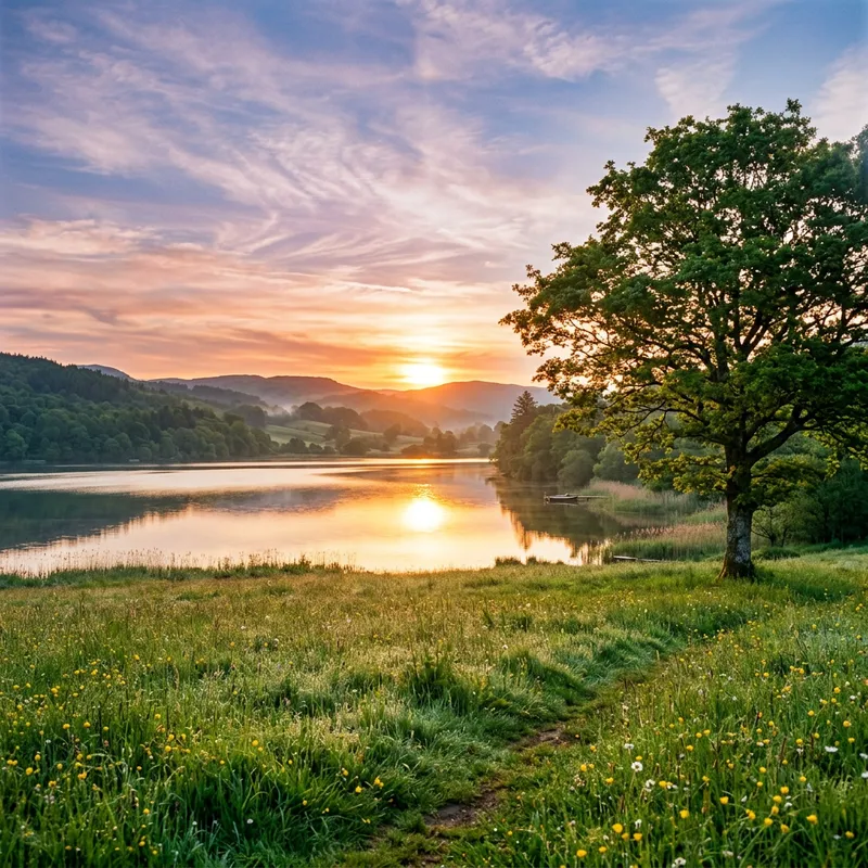 A random untouched photography of a serene landscape under the bright morning sun. In the foreground, an expansive lush green field carpeted with dew-touched grass, leading up to a calm lake that peacefully reflects light from the awakening sun, casting a golden sheen across its surface. A mature broadleaf tree proudly stands at the right, its leaves fluttering gently in the early morning breeze. Rolling hills grace the background, bathed in the soft light of dawn. The sky above is a dome of radiating orange and purple hues, embellished with wispy cloud formations. The scene emanates an overall aura of tranquility and harmony with nature.