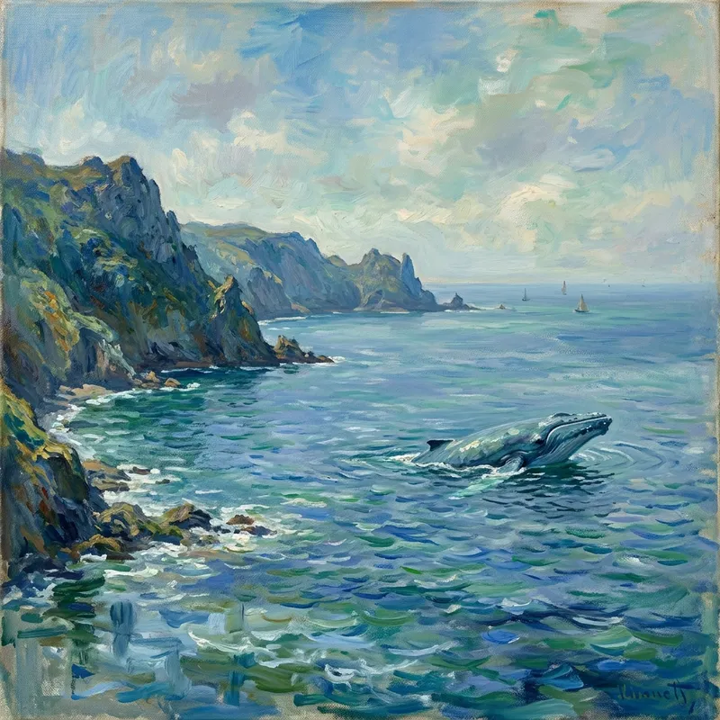 Create a serene oil painting that captures a peaceful scene washed in shades of blue and green. The scenery includes a tranquil ocean view dotted with jagged, rocky cliffs. The true spectacle of the image emerges from the water - a majestic whale swimming with grace and serenity. The painting style is subtly reminiscent of Claude Monet who worked prior to 1912, featuring soft brushstrokes that beautifully capture the essence of tranquility. It seems like a work that could be displayed as a masterpiece in an art gallery.