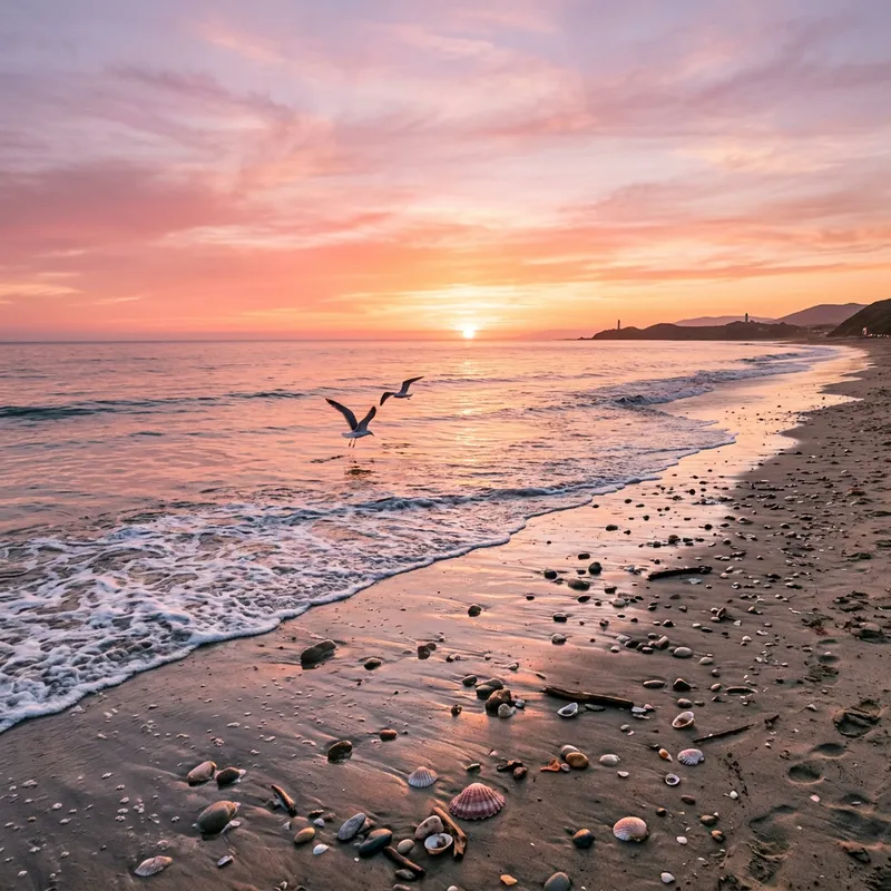 Tranquil Ocean Sunset with Seashells and Seagulls