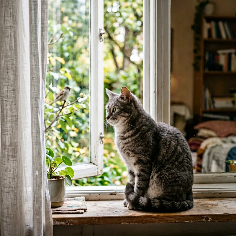 An image of a cat sitting on the windowsill, its tail curled around its paws. The cat is a short-haired breed, with soft fur of alternating stripes of dark and light grey. Its world is illuminated by a soft light filtering through the window. The eyes of the cat, green and luminous, are gazing into the distance, perhaps at a bird or squirrel outside. There's an air of tranquility about the scene, interrupted only by the faint rustling of the curtains moved by a silent breeze.