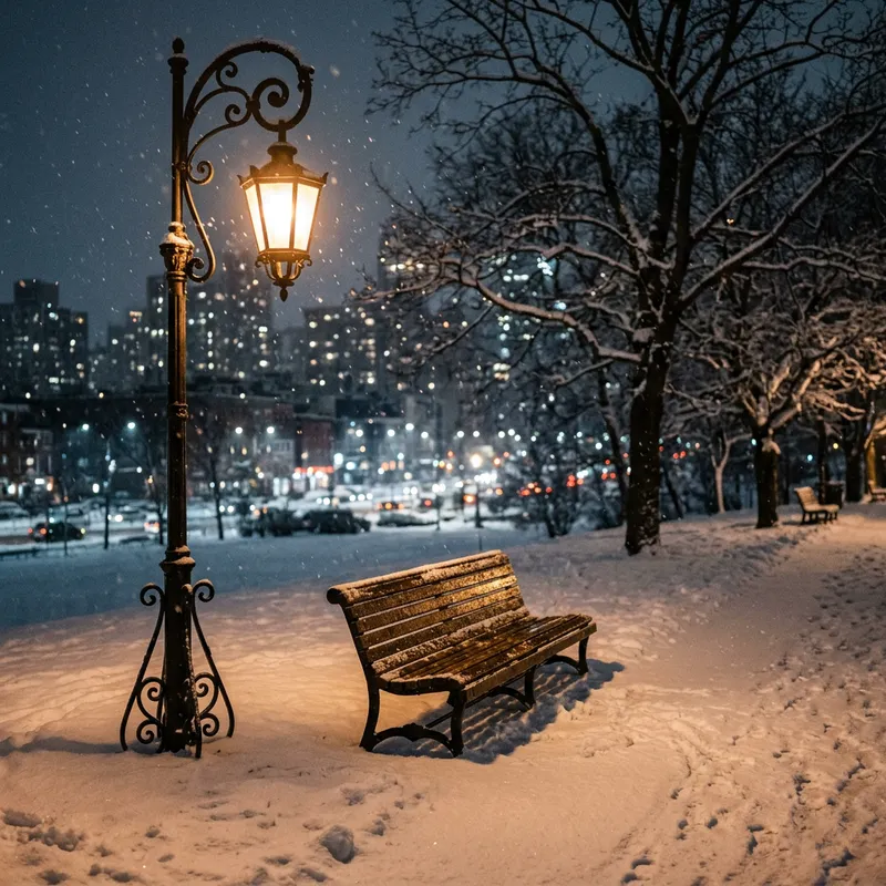 A dark snowy evening in a city. An illuminated lamp post casting a warm glow on the freshly fallen snow. An empty bench nearby, its wood glistening wet under the light. The scene is calm and quiet, painting a picture of solitude amidst the bustling urban landscape.