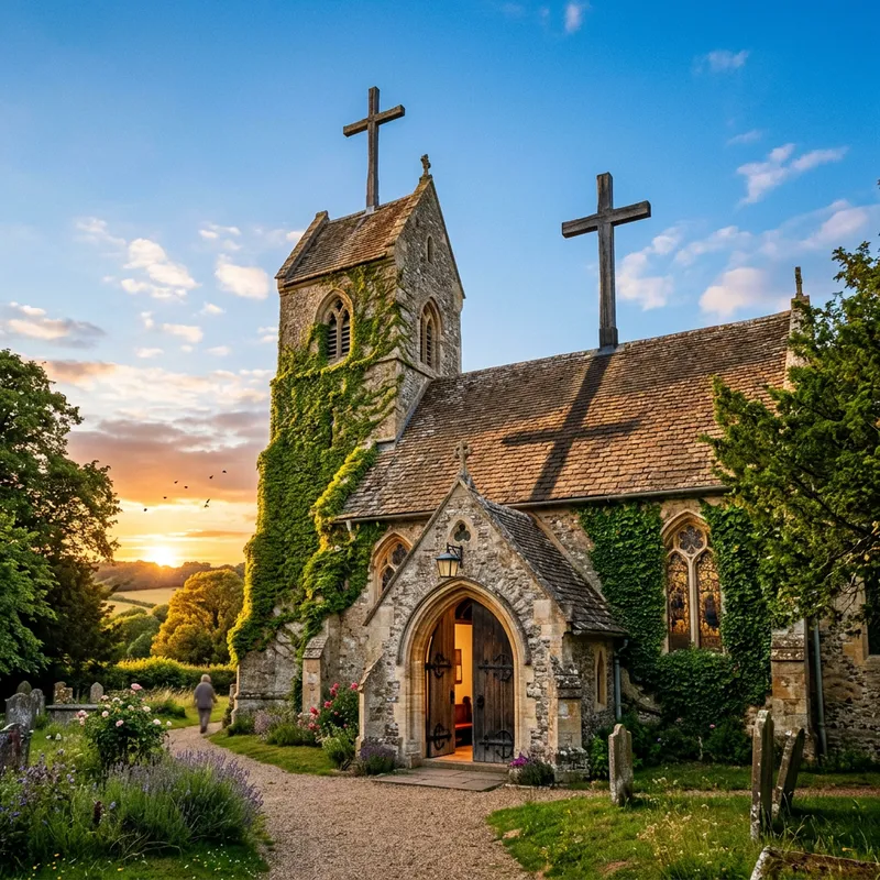 Imagine a captivating scene of an aged stone church under a brilliant blue sky. The church radiates a comforting sense of tranquility and spirituality. Its arched wooden doors are invitingly ajar. Two large, beautifully sculpted crosses, made of aged weathered wood, stand tall on the sloping church rooftop, casting long shadows as the sun sets in the background. These crosses symbolize faith, serving as a beacon of hope and motivation. Verdant green ivy slowly creeps up the ancient stone walls, giving the structure an almost ethereal feel.