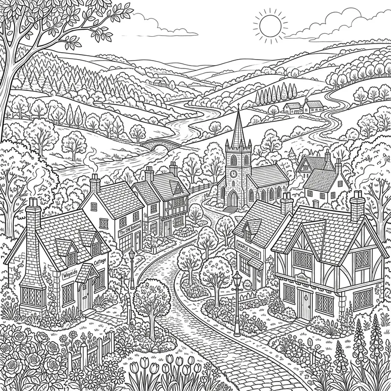 An image showcasing a picturesque village nestled in a tranquil valley. The houses with their different shapes and sizes are quaint, featuring chimney stacks and shingled roofs. The streets are lined with well-groomed trees and flower beds teeming with a variety of blooms. The village is surrounded by lush hills, speckled with distant groves and rivers. Overhead, the sky is clear with the sun casting a gentle light over the entire landscape. It is designed in a way that lets you add your own colors to bring the scene to life.