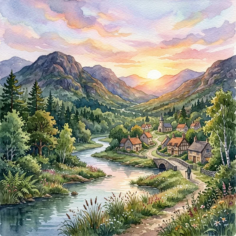A serene landscape depicted in a watercolor painting style. It could consist of a tranquil river flowing through a lush forest teeming with a variety of plants, or it could be a quaint village nestled in the valley of round, rough, rugged mountains. There's a possibility of a soft, soothing sky with swirls of pastel hues, and the resplendent sun could be setting or rising at the horizon.
