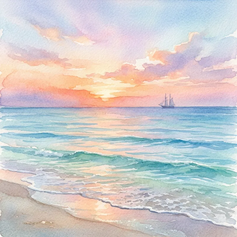 A picturesque seascape, rendered in the delicate touch of watercolors. Envision soft streaks of blues and greens representing the ebb and flow of the ocean waves. The sky filled with pastel hues of the setting sun - orange, purple and pink - blending seamlessly into the horizon. In the distance, imagine a faint outline of a ship sailing away. The overall image should evoke a sense of calm and tranquility, characteristic of a serene ocean view.