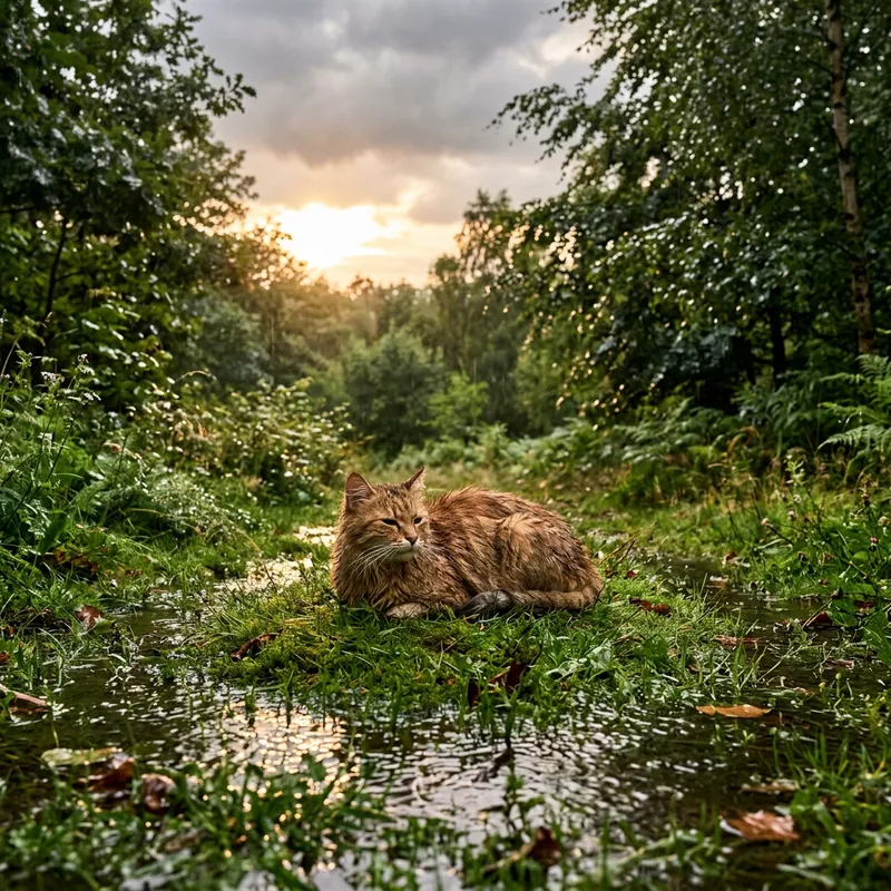 A soaked feline idly lounges within the center of a lush green clearing. Rain droplets are visible on her sleek coat, reflecting the fading sun as it peeks from behind the departing storm clouds. Around her, you can see puddles of water shimmering on the grass, evidence of the recent rain. Wet leaves on the nearby trees gently sway in the cool post-rain breeze which is filled with the earthy scent of petrichor. The setting evoking an atmosphere of serene peace and tranquility.