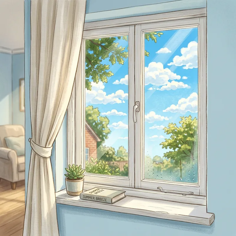 An illustration of a closed window on a sunny day. The window glass reflects the blue sky and fluffy white clouds outside. It's a picture of tranquility and comfort, symbolizing a cool, air-conditioned interior. Subtle aspects of the image suggest the cool air inside, like a small condensation droplet on the corner of the glass, hinting at the difference in temperature between the exterior and the interior of the room. The window frames are painted white, adding to the freshness of the scene. The window is adorned with a simple, light-colored curtain.