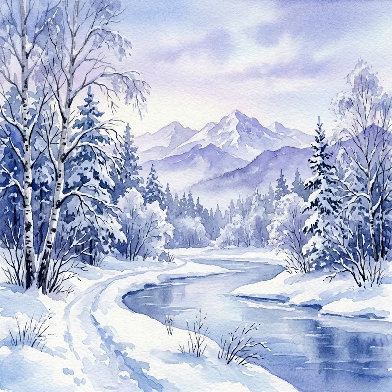 Watercolor painting of a tranquil winter morning landscape. The scene captures the serenity of nature with snow-laden trees and distant mountains. Color palette features softly blended shades of blue, violet, and white, providing a sense of coldness and tranquility. The artwork is done on cold-pressed watercolor paper, utilizing traditional watercolor techniques to bring out the finesse and the subtleties of the scene.
