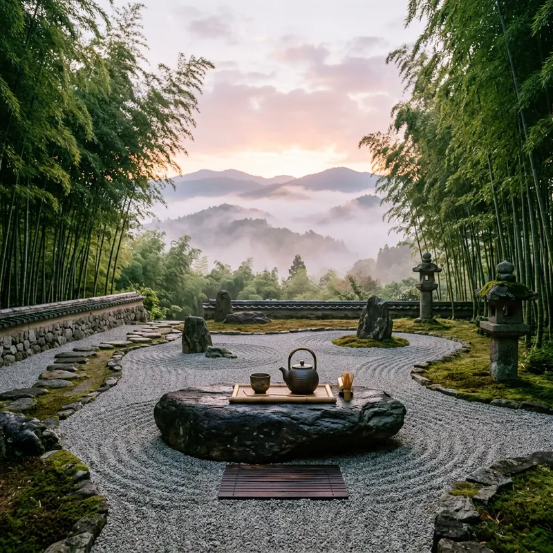 A tranquil and serene setting depicting harmony and zen. During sunrise, a bamboo grove gently sways in a light breeze, framing a beautifully manicured zen rock garden. The central focus is a large, flat stone upon which sits a simple ceramic teapot, ready for a ceremonial tea. In the distance, mist-laden mountains mirror the hues of dawn, adding depth to the scene. Traditional Japanese lanterns cast soft shadows, adding an element of mystery. The calmness of the scene invites introspection and tranquility.