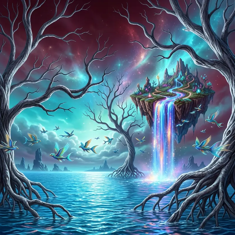 Imagine a surreal landscape that pushes your understanding of reality. The sky is a glowing mixture of burgundy and turquoise, seamlessly blending into each other. Large, leafless trees with silver bark reach out with their gnarled branches, their roots breaching the surface of the cerulean ocean below, ripples of light reflecting off its gentle waves. Unusual creatures of iridescent hues, half-way between bird and fish, dot the horizon, suspended between the sky and the water. In the distance, a waterfall cascades from a floating island, a spectacle of colors as it catches the light from the ethereal sky.