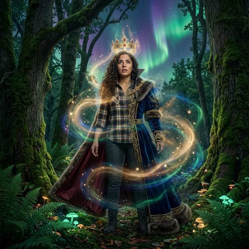 Depict a transformation scene set in a fantastical realm, where a Hispanic woman in modern casual attire is morphing into a noble lord. Her casual clothes are gradually turning into ornate, medieval-style lord's attire with velvet robes and a golden crown. This poignant moment is captured in the heart of a lush forest grove, with ancient, towering trees and abundant mystical auroras. Ethereal wisps of magic and light swirl around the scene, symbolizing her rise in status. Her facial expression shows surprise, awe, and determination.