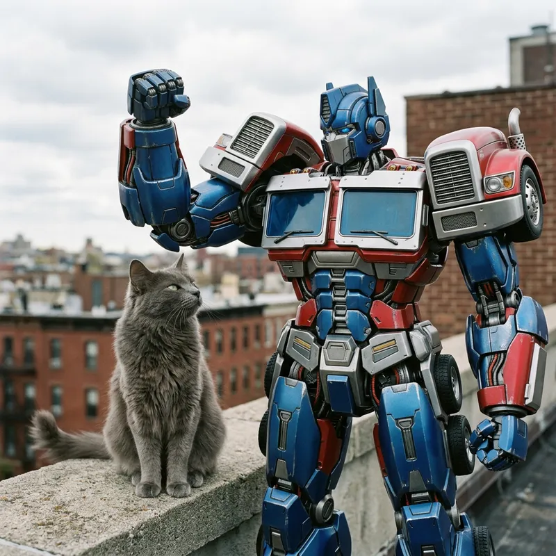 A grey domestic feline sits side by side with a large figure, heavily built and covered in metallic blue and red armor. The figure has its one arm raised in a gesture of solidarity, a symbol of the fight for justice and peace. A windshield-like chest piece, semi-truck cab adornment over the shoulders, and other vehicle parts scattered throughout the figure's design are palpable hints of its incarnation as a transformational vehicle. The cat, on the other hand, is watching this figure with a mixture of curiosity and suspicion, its tail curling and uncurling as a sign of unease.