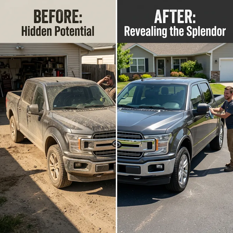 Transforming from dirt to glory: a journey that goes beyond the surface. In this image, we see the before and after of seemingly ordinary dirty cars. Behind the layer of grime and unkemptness, the potential to shine in all their splendor awaits. Ford Lobo trucks, with their commanding presence, symbolize the strength and power that can emerge once they are given the proper care and attention. Like these trucks, sometimes we only need a bit of polishing to reveal our true brightness. Let cleanliness unveil the greatness within!
