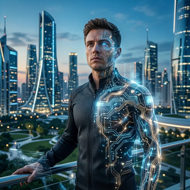 An interpretation of transhumanism showing a visually striking fusion of a human and artificial intelligence. A Caucasian male with short hair is half-fused with a complex network of glowing circuits resembling a super-intelligent AI, showcasing the transformation of humanity into a higher state of being. Viewers should be able to see a dichotomy between man and machine. This piece is set against a futuristic city backdrop, with sparkling skyscrapers under the glow of an ethereal dusk. High technology takes the forefront, while nature becomes blurred in the background, signifying the age of digital transcendence.