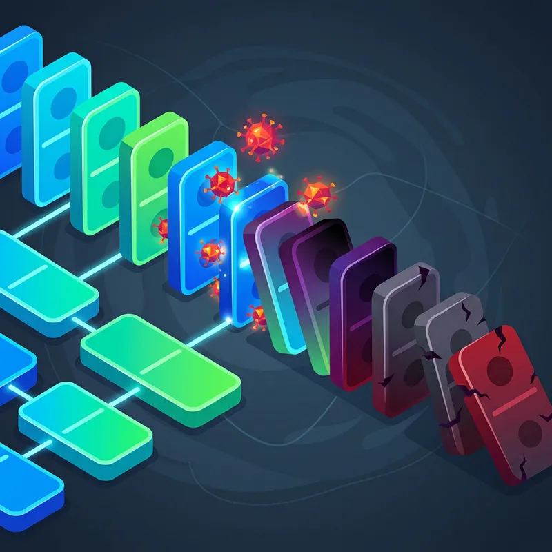 An abstract illustration that represents the transmission of infection. Perhaps it could be designed with a series of interconnected domino-like blocks depicting cells. Some of these blocks could be in a vibrant, healthy color, while others, the infected ones, could be depicted in a darker, ominous color. Additionally, transitional blocks could symbolize the process of infection, transitioning from the healthy color to the infected one. A series of small, virus-like entities could be shown interacting with the domino-cells, representing the virus causing the infection.