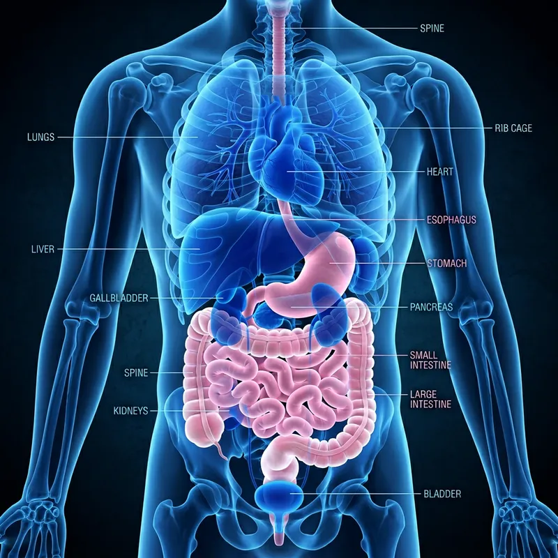 A detailed anatomical rendering of a male human torso viewed frontally, depicted in a semi-transparent shade of blue. The muscles are omitted, revealing the internal organs. Features such as the lungs, liver, and large intestine are represented in differing tones of blue, each subtly distinct. The esophagus, stomach, and small intestine are illustrated in soft pink shades, differentiating them from the blue organs. The colors should evoke an X-ray image, but with a colorized interpretation that is both educational and aesthetically pleasing.