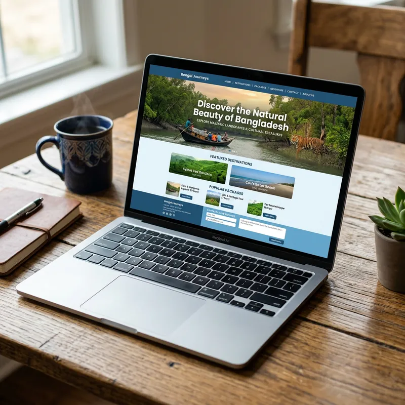 Imagine a laptop on a wooden table, opened to display a website. The website is characterized by a sleek and modern design, using a palette of calming blues and whites. The navigation bar shows options like 'Home', 'Destinations', 'Packages', 'Contact', and 'About Us.' The homepage boasts impressive images of various tourist destinations, with emphasis on Bangladesh's natural beauty. There are sections providing detailed information about various travel packages and a contact form at the bottom for inquiries.