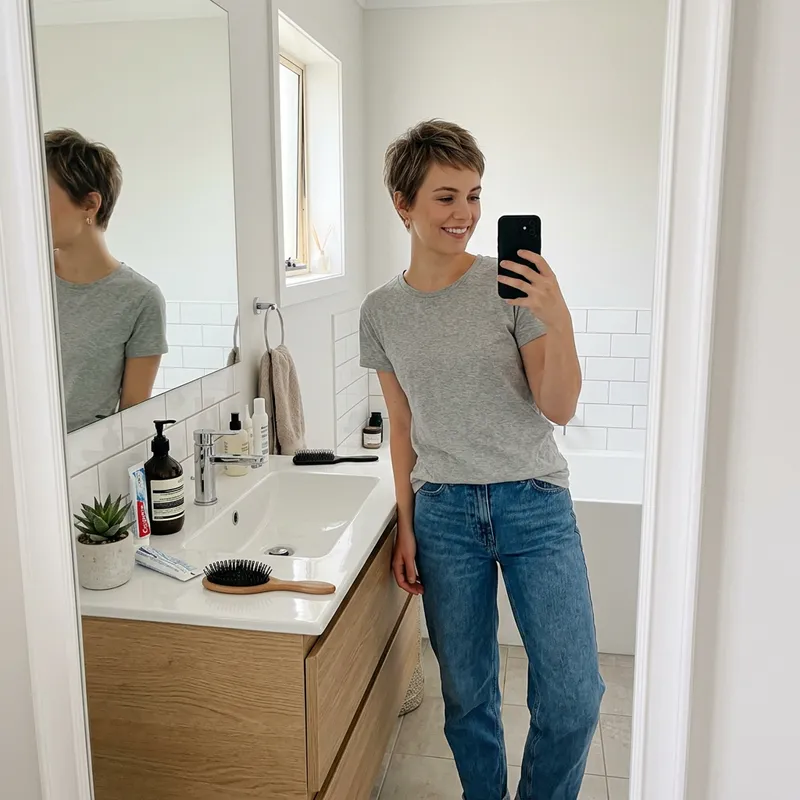 A woman with short hair, showcasing her new haircut in a mirror. She has a Caucasian descent and is wearing a comfortable casual outfit such as a simple T-shirt and jeans. She is smiling subtly at the reflection in the mirror, and you can see her trendy short haircut. The background showcases a neat and clean bathroom, with a sink and some toiletries lined up beside the mirror.