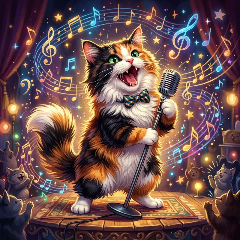 A vividly illustrated image of a fluffy, tri-color cat mid-song. The cat's mouth is open wide as if belting out a tune, with its emerald-green eyes glittering with confidence. Its fur is a mixture of black, white, and orange, each color distinguishing itself. The background consists of a variety of musical notes floating around, symbolizing the melody produced by this singing cat.