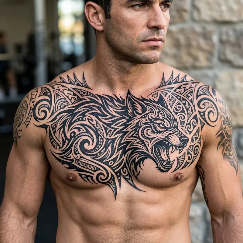 Design a tribal-style wolf tattoo suitable for a man's chest. The design should incorporate intricate patterns and curved lines reminiscent of tribal art. The wolf's figure should be formidable and prominent, as it takes center stage in the composition. Ensuring the design is monochromatic, focusing on black ink for contrast against the skin, creating an impactful and fierce depiction.