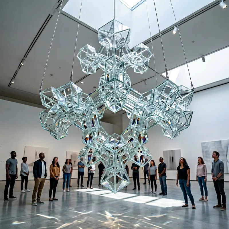 A clear glass sculpture exhibiting the pattern of Tribonacci solid is suspended 8 feet above the ground. The sculpture is captured through a wide-angle lens, revealing its intricate details and minimalist art form. The sculpture is of geometric precision, presenting an ethereal atmosphere, and gives an abstract representation of a diverse set of people standing inside. The scene is inclusive of people of various descents and genders, showcasing their figures encapsulated within the mysticism of this mathematical pattern.