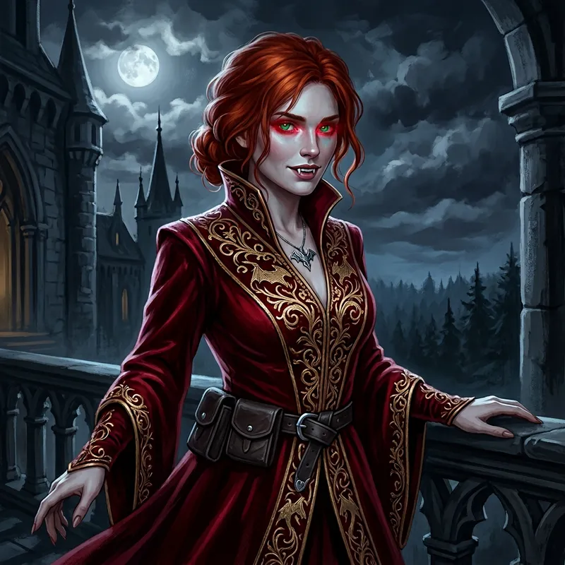 A digital illustration of Triss Merigold, a character from The Witcher series, reimagined as a vampire. She has vibrant red hair, sparkling green eyes, and fair skin. She wears a crimson velvet robe with intricate gold embroidery. Her elongated, sharp canine teeth glint in the moonlight, while her eyes have a mesmerizing red glow. While maintaining Triss's signature elegance, her normally welcoming countenance now carries an eerie, predatory aura.