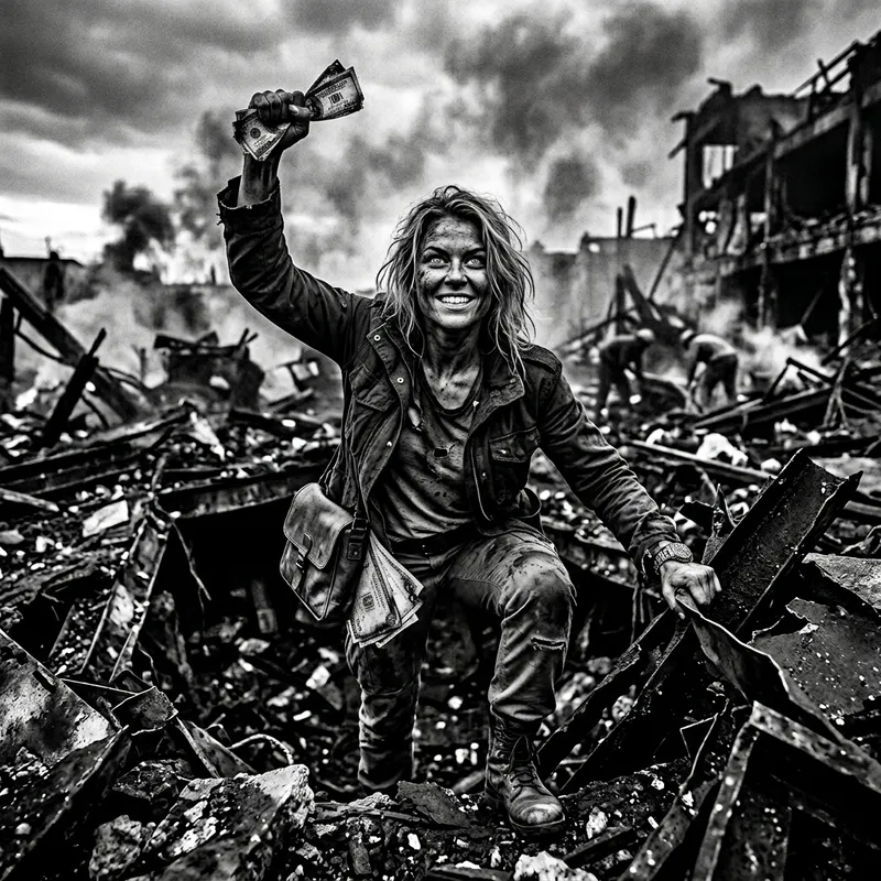 A high-powered photograph of a triumphant Caucasian female forex trader emerging from the remnants of a smoldering wreckage. The image is captured in a high contrast black and white technique, emphasizing the grit and determination visible in her strong facial expressions. The shot is taken from a low angle, producing a dramatic effect akin to an award-winning photograph. The image exudes an aura of success and resilience, akin to those taken by a high-end camera like the Canon EOS R5.