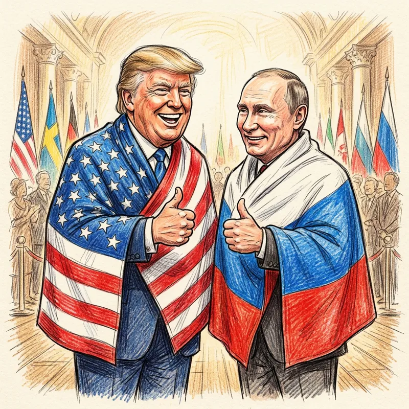 Trump and Putin dressed in the flags of their country in a pencil art cartoon style, looking together, smiling, thumbs up, showing I like it gesture.