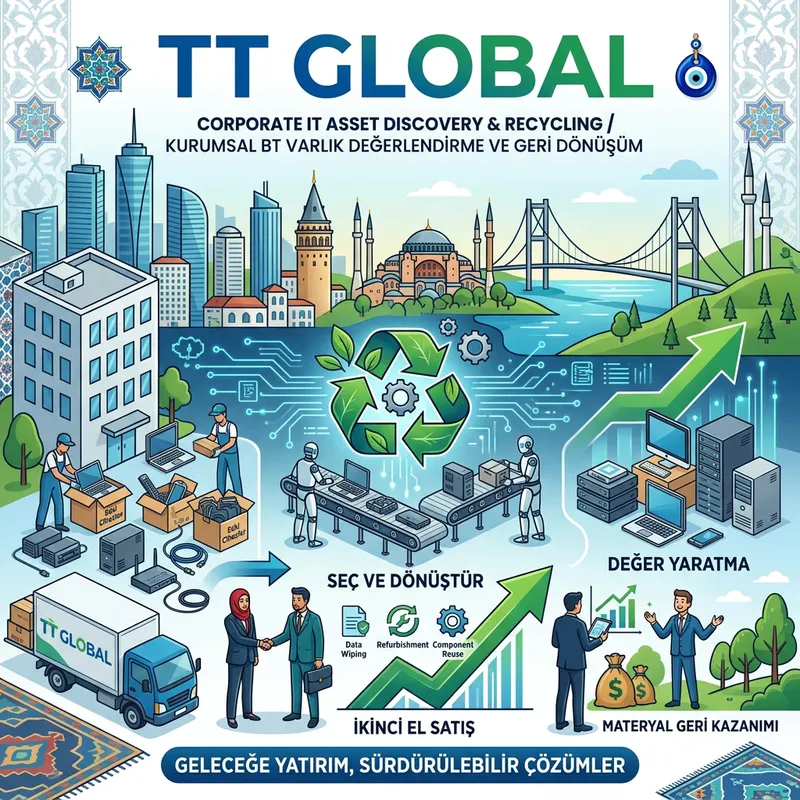 Create a graphic for a business called TT GLOBAL that specializes in purchasing IT products which companies no longer find useful. Use elements related to technology and recycling to illustratively communicate the business function. The illustration should also have the company name, TT GLOBAL, prominently displayed. Please include certain Turkish cultural elements to make the image relatable to a Turkish audience.