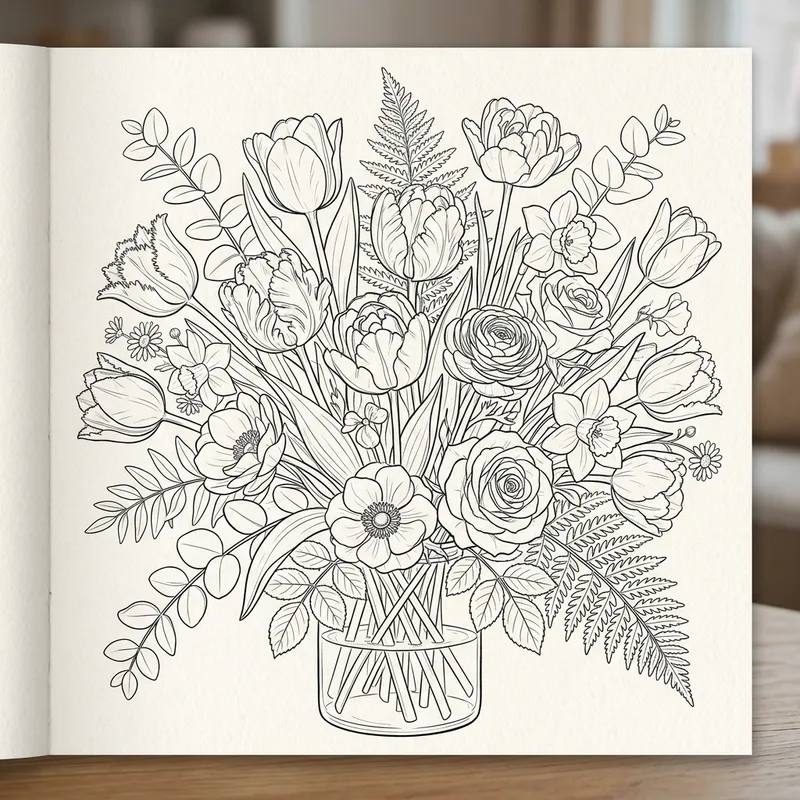 Create a highly detailed pencil sketch suited for a coloring book meant for neurodivergent adults. The sketch will be of a close-up view of a tulip bouquet filled with diverse flowers and leaves, drawn from a distance of 1 meter. Show distinct lines and clear spaces for individual coloring, without incorporating excessive details such as intricate petal patterns or shadows. The detail level should be intricate enough to allow the coloring of individual leaves. The image should fit a page measuring 25x25 cm. The aim of this image is to offer a therapeutic and stress-reducing activity that improves focus and wellness, suitable for printing on paper.