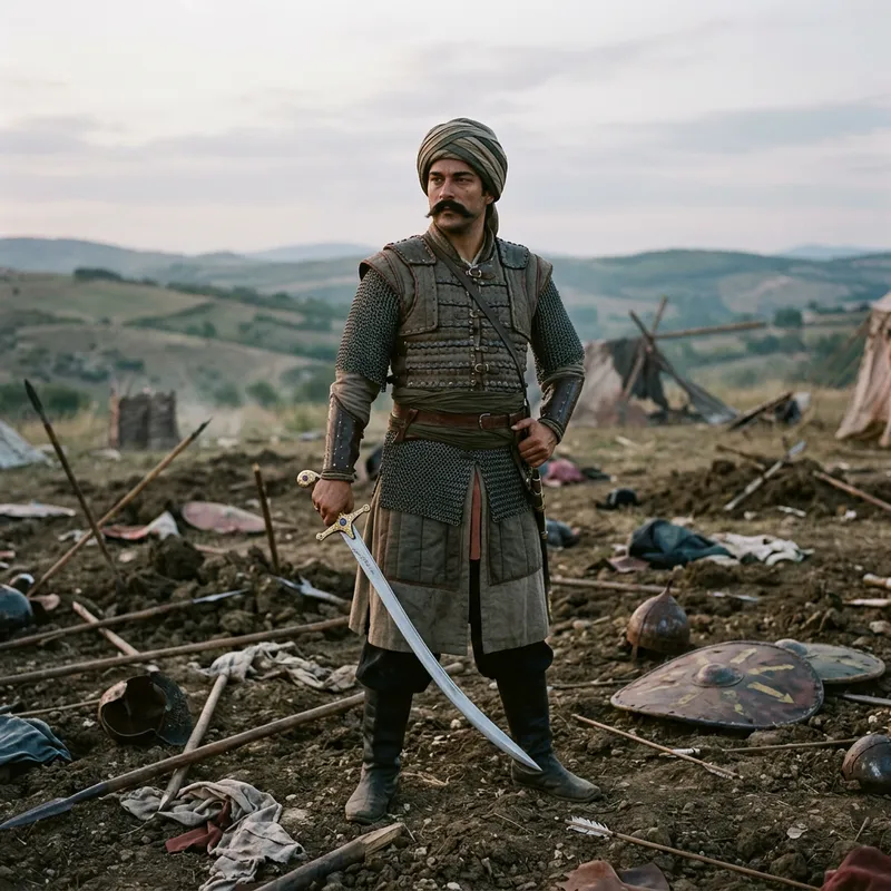An image showcasing a Turkish soldier, wielding a sword confidently in his hand. He stands amidst the quiet aftermath of a battlefield, the conflict now over. The landscape is littered with signs of the battle that took place - fallen weaponry, churned up earth and discarded shields. However, tranquility reigns now, serenity replacing the earlier chaos of the battlefield. The soldier, despite the strain of battle, maintains a resilient posture, a testament to his unyielding spirit.
