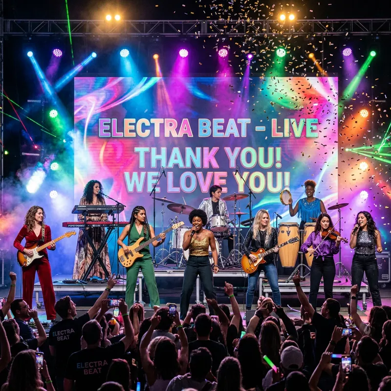 An all-female music band performing onstage. The band consists of nine members, demonstrating a range of descents such as Caucasian, Hispanic, Black, Middle-Eastern, South Asian, and White. The stage elements are filled with vibrant, colorful lights accompanied by a high energy crowd. The members are dressed in elegant, stylish, but comfortable attire suited for dancing. The stage settings entail advanced audio-visual equipment, and the atmosphere is full of excitement and fandom. Confetti falls from the sky as the band wraps up a high-energy performance.
