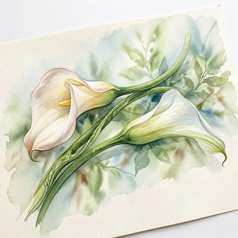 Create a watercolor painting of two calla lilies resting on their side with an emphasis on their elegant curves and subtle gradients. The painting should focus on the light filtering through the delicate petals and showcase intricate details in the stems, all while preserving the serene botanical essence. Use a vibrant but soft color palette to capture the scene.