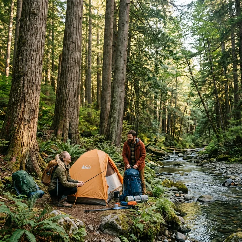 Two hikers setting up camp in a pristine forest clearing beside a crystal-clear mountain stream. Towering thousand-year-old Douglas firs and western red cedars stretch endlessly skyward. The scene is perfect wilderness - untouched, beautiful, and peaceful. Late afternoon golden light filters through the canopy. The hikers appear happy and relaxed, unaware of what's coming.
