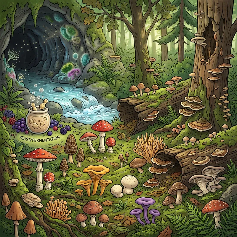 An animated depiction of various types of fungi, including mushrooms, yeasts, molds, and more. The scene can be that of a lush forest floor covered in distinct mushrooms with their unique cap shapes, stalk lengths, and colors. Perhaps some fungi can be seen on the barks of trees or on fallen logs, showing how they aid in decomposition. Near a bubbling brook, yeasts could be visualized as they are vital in fermentation processes. Lastly, a damp and dark cave could show a variety of molds, their spores in the air, symbolizing their role in decay and nutrient recycling.