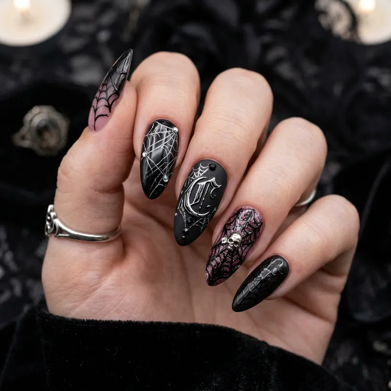 Gothic Almond Nails: Black & Pink Spider Gel Art